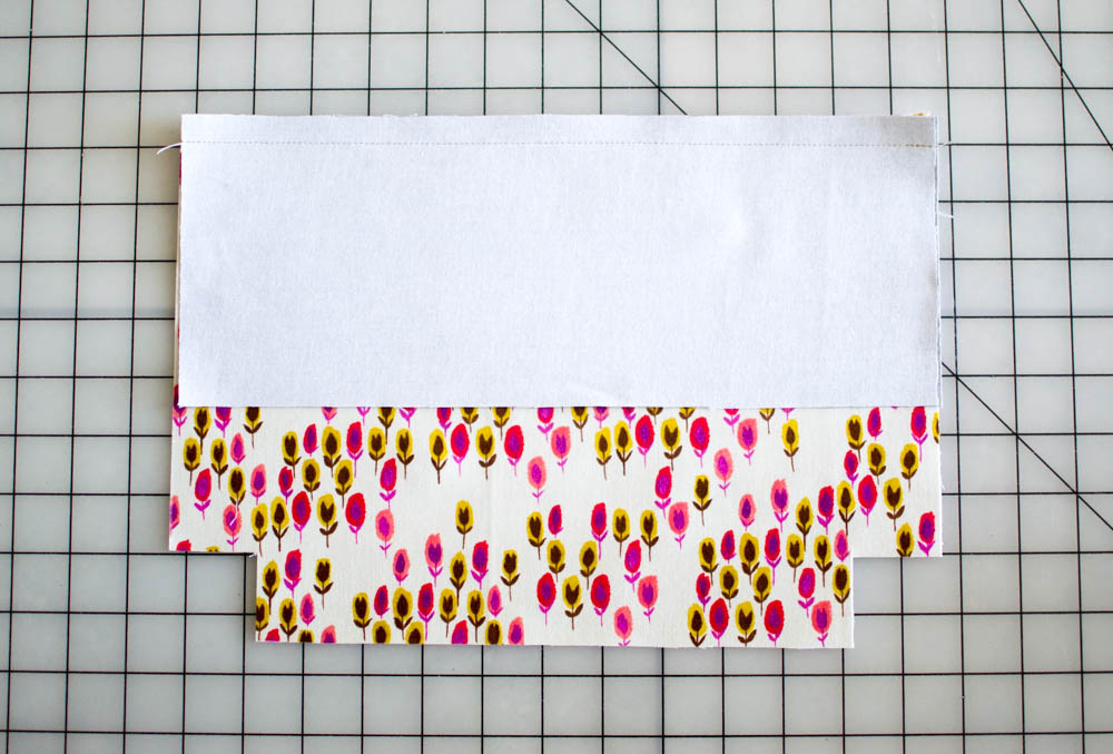 Apply interfacing to all of the pieces that have asterisks above: the exterior and lining print fabrics, the slip pocket, all 4 coordinating top panels, and the strap piece. If you are using fusible fleece, do not apply it to the slip pocket piece.