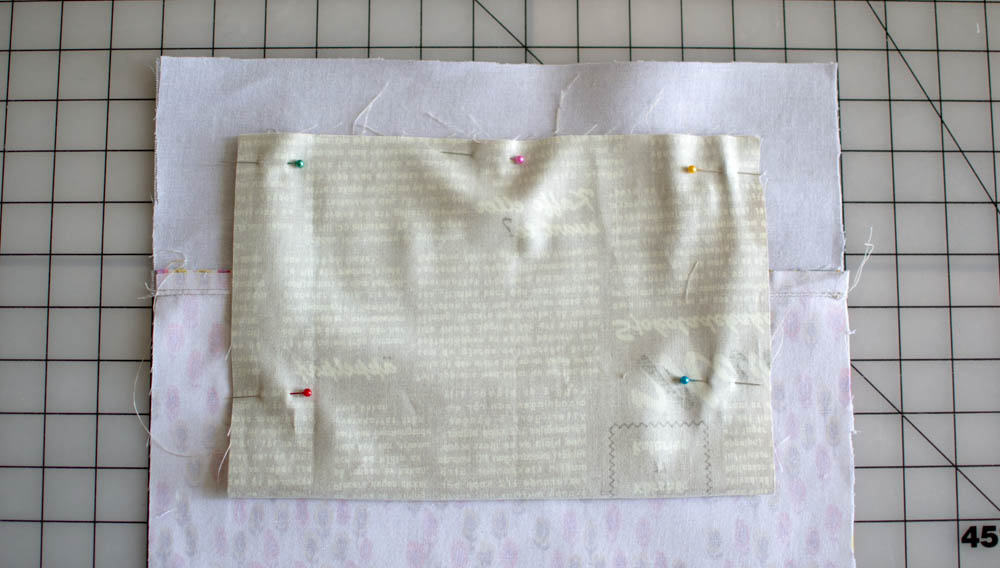 2. Pin the pocket piece to one of the bag side pieces (either interior or exterior, where ever you want the zipper pocket) right sides together.