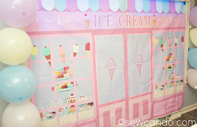 To complete our tablescape (and hide a broken window that was being replaced a few days later) I got this ice cream parlor backdrop - also from Amazon. I figured we could use it for some fun photoshoots and, with a 1yr old daughter added to our now large family birthday list, more parties down the road. I flanked it with some of the party set balloons, which were a perfect color match: