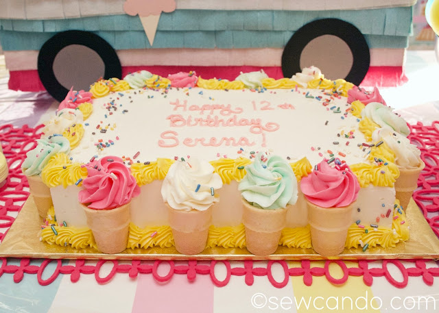 The cake was done by our favorite local bakery, Sorella's. I saw a round cake online that had ice cream cones on the sides with frosting "scoops" and thought that kind of design would be ideal, just made bigger as a sheet cake. There's usually squabbling over the cake section with the most frosting, so this way everyone got it!