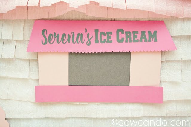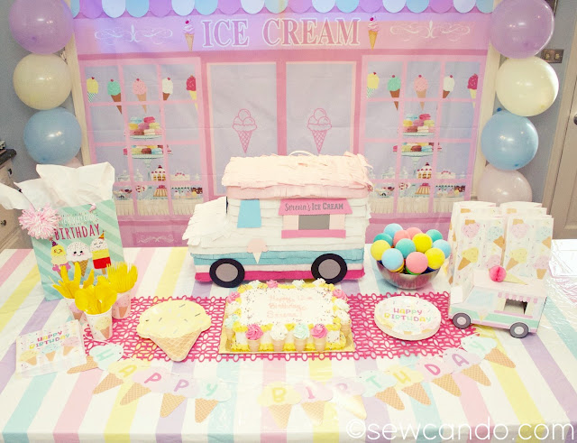 Dessert plates and plastic tablecloth were included too, plus an ice cream shaped birthday bunting, which was a nice detail for the table. I reused a hot pink felt cut-out table runner leftover from our previous Sewing Themed Birthday Party.