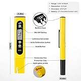 Automatic calibration the digital ph meter for water uses a 3point automatic calibration method calibrating the electrode to solutions of ph 400 ph 686 and ph 918 to ensure the accuracy of your measurements Wide application and 100 quality guarantee boosting with pocket size the ph tds meter digital water tester is ideal for drinking water daily household hydroponics lab teaching and more use Cleaning cloth for free and three extra batteries as spare If our digital ph meter doesnt meet your needs for any reason just send it back for a full refund or a replacement within five years