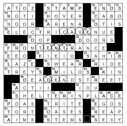 Theme: SHELTER IN PLACE (51. Way to stay safe ... or what each set of circles represents vis-à-vis its answer) - Three shelters are hidden inside each theme answer.